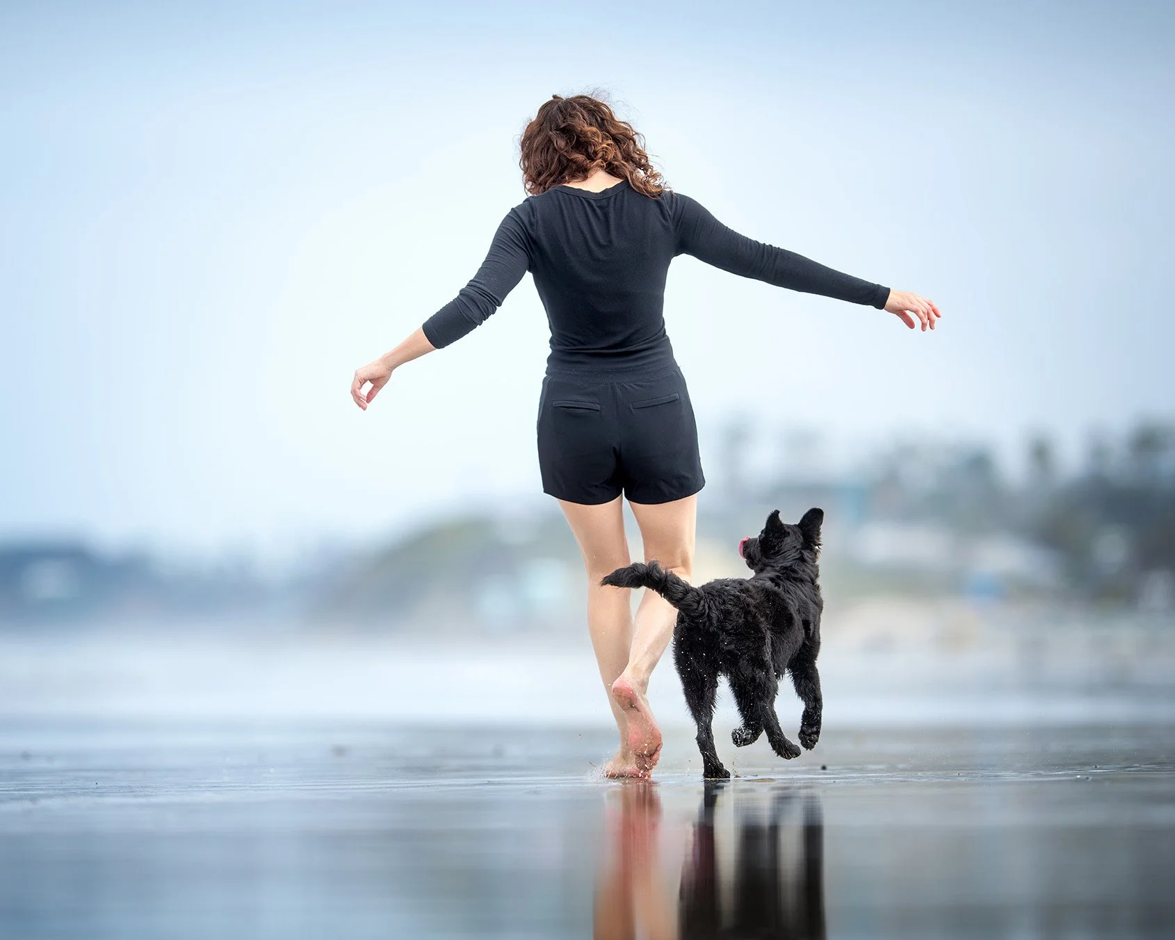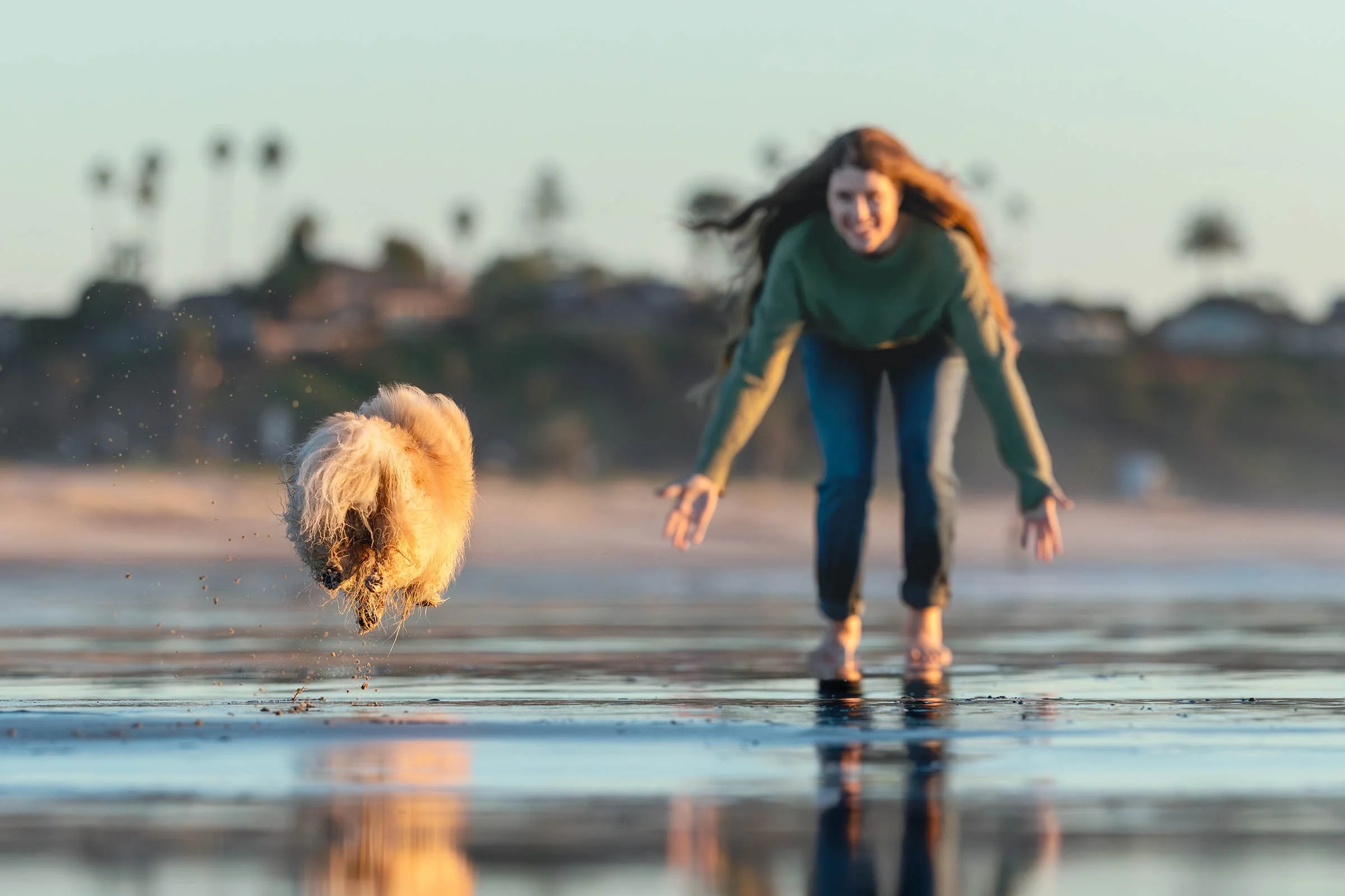 Keala researches locations, tides, sunrise and sunset, how busy a spot will be at certain hours. She does all of that work for you so you just show up and play with your dog. She was right there with us — laughing, getting in the sand, soaked by waves and not caring for a second. She was 100% there.