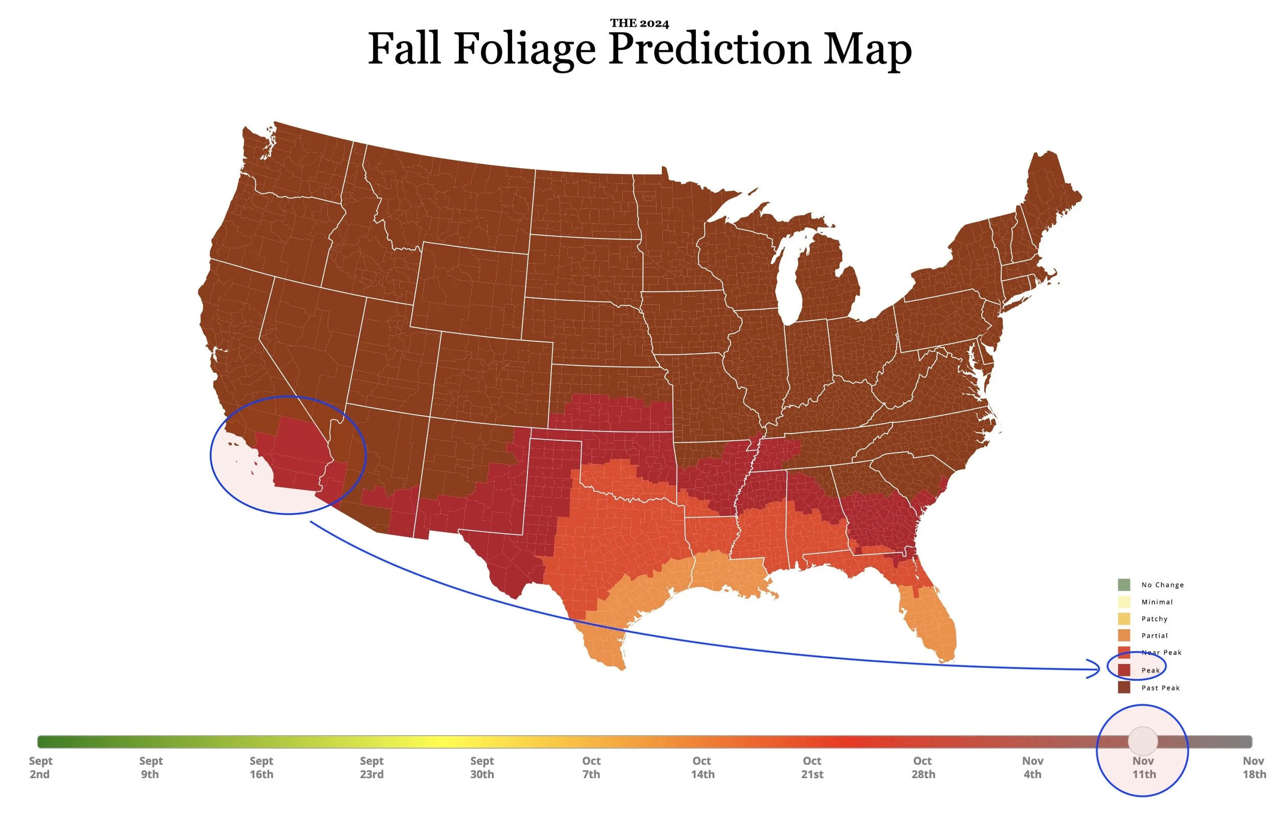 (UPDATE 10/28/24) According to the interactive prediction map, Southern California begins peaking on November 4th, reaching its peak on November 11th, and past peak on November 18th. I will go on record to say that due to the extreme summer heat in 2024, it’s likely our Autumn season will fall short of expectations this year. I’ve visited inland parks in early October and everything was very brown, dead, and dry.